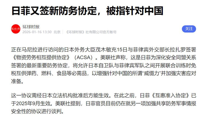 2026年1月15日。日本外务大臣茂木敏充抵达菲律宾,与菲外长拉扎罗签署所谓《物资劳务相互提供协定》。这个晦涩名字之下,真相只有八个字:“军事互通,借壳生蛋”。