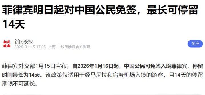 菲律宾这一边刚签完日本的新军协,1月15日就转头对中国游客敞开怀抱,宣布14天免签。这算盘打得响亮,一边向中国伸手要钱,一边帮日本递刀子。这不叫精明,这叫吃相难看。