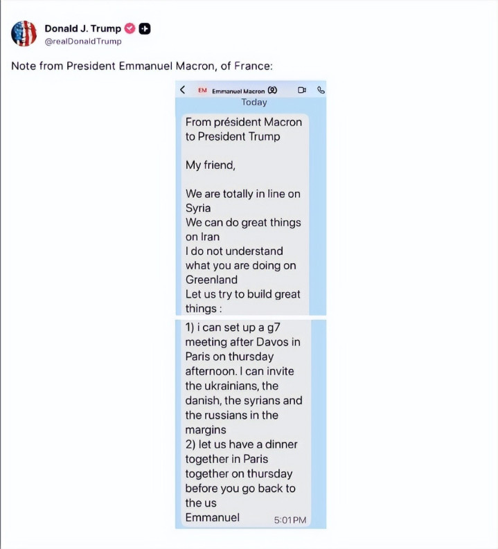 1月19日,特朗普公开曝光了马克龙发给自己的私人短信,内容里马克龙一边表达对特朗普觊觎格陵兰岛的困惑,一边主动示好,称法国可以配合美国在伊朗问题上“做很多事”,甚至提议安排G7会议和私人晚餐,试图以此转移特朗普的注意力。