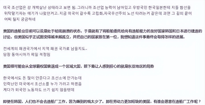 韩国网民的评论还涉及了对美国造船业、韩国国防预算分配等更宽泛的话题。