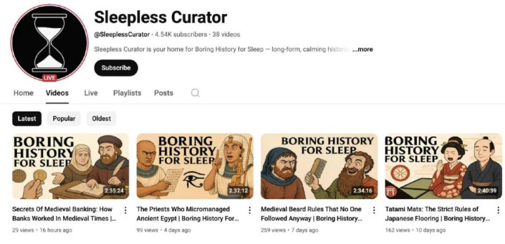 旧年4月,一位博主“Sleepless Historian”在YouTube上发布了一条2小时的历史视频《为什么在中叶纪一天齐活不下去》,播放量近400万。自此,他运行上传AI历史故事类长视频,仅一个月账号便涨粉超35万。基于AI主导创作历程,大多数AI历史频说念不错作念到一天一更,致使在十几小时内就能更新一条视频。