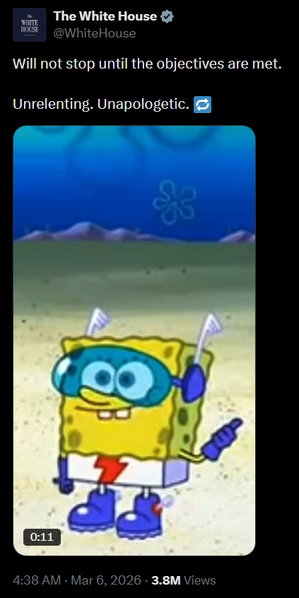 3月6日,好意思国白宫官方酬酢媒体账号发布联系“史诗狂怒活动”的编订视频,其中出现了卡通形象海绵宝宝和果真的军事打击场景切换的画面。