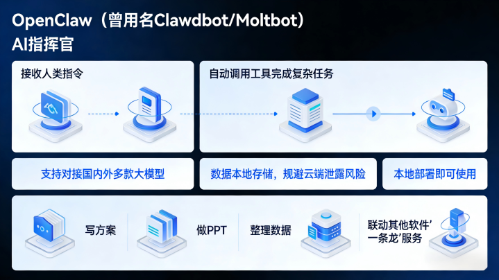 OpenClaw(曾用名Clawdbot/Moltbot)定位为“AI素质官”,中枢功能是领受东谈主类领导后,自动调用器用完成复杂任务。