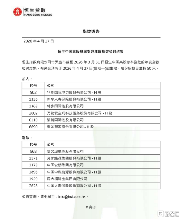 4月17日,恒生指数有限公司文告截止2026年3月31日恒生中国高股息率指数的年度指数检查成果。相关变动将于2026年4月27日(星期一)起见效。成份股数量保管50只。