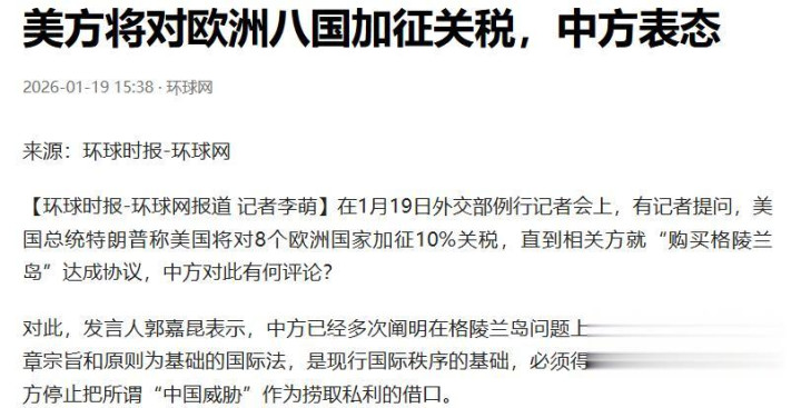 美方将对欧洲八国加征关税,中方表态 2026-01-19 15:38·环球网