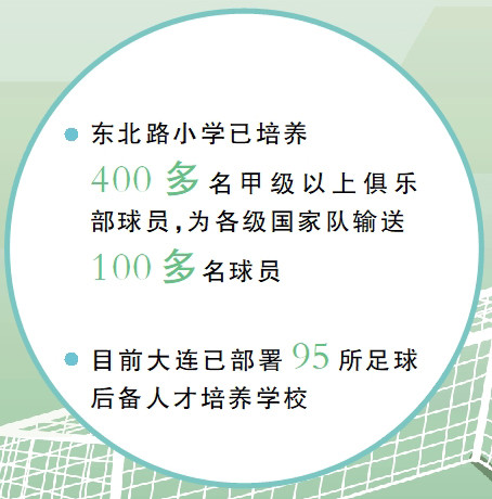 “东北路小学在选材上具有优势,市、区教育部门允许其跨学区甚至跨区招收足球特长生。”大连市沙河口区教育局安体卫科科长于丽君介绍,全区构建了分年龄段的人才选拔机制。小学阶段,以东北路小学为足球区级中心校,玉华小学、中心小学、锦绣小学、南平小学4所为片区足球重点校,20余所小学为普及校,合力培养足球苗子。