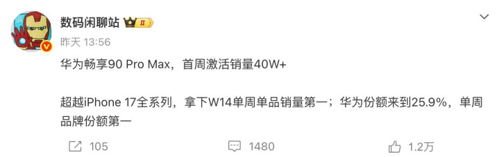 说起来华为畅享90系列机型的话,就在首销日的销量就达到了25万台,其中华为畅享90 Pro Max的首周激活量就达到了40多万台,这样的收货亦然远超了iPhone 17系列的单机销量收货,毫无疑问就华为畅享90系列机型的销量势头亦然很猛的。