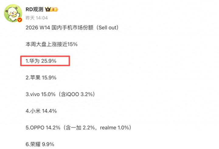 近期华为手机的销量势头还是较猛的,就证实数码博主RD不雅测的统计数据暴露,就在曩昔的14周,华为凭借着25.9%的市场占比反超苹果成为了暂时的第一,针关于华为为什么能够在14周赢得这样好的收货,此前著作中也有说起,肤浅来说即是因为华为畅享90 Pro Max的销量收货太好了。