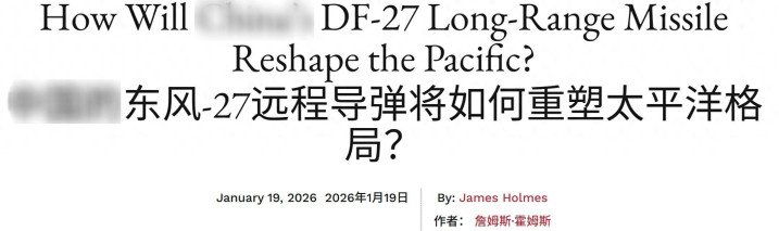 中国在高超音速技术领域取得领先之后,美国军事专家一度采取轻视态度,压根没把美国的落后视为大问题,如今美国专家彻底清醒了。在2026年1月19日,美国媒体《国家利益》杂志上,美国军事专家詹姆斯·霍姆斯发表了一篇文章,提出东风-27反舰弹道导弹已经确认在战备值班。这是美国五角大楼报告中提到的内容。