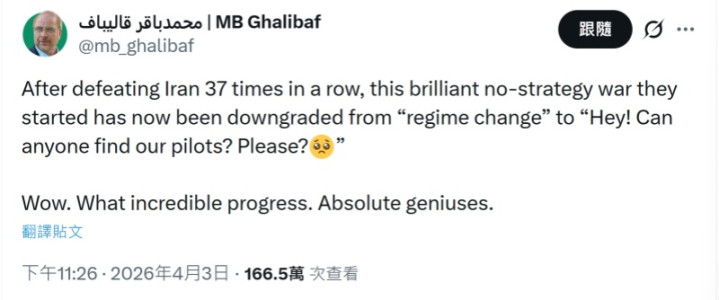 “在(声称)延续37次打败伊朗之后,他们(好意思国和以色列)发起的这场自视精粹却毫无战略的搏斗,如今也曾从‘政权更替’左迁成‘嘿!有谁能找到咱们的翱游员吗?托福’。何等惊东说念主的跳跃!几乎是天才!”卡利巴夫写说念。