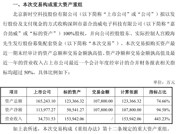 时空科技(605178)4月17日晚间公告,公司拟通过刊行股份及支付现款的方式向张丽丽、陈晖等19名来往对方购买深圳市嘉合劲威电子科技有限公司(简称“嘉合劲威”)100%股份,并向公司控股鼓舞、骨子扫尾东谈主宫殿海刊行股份召募配套资金。本次来往组成首要财富重组,来往价钱为10.78亿元。