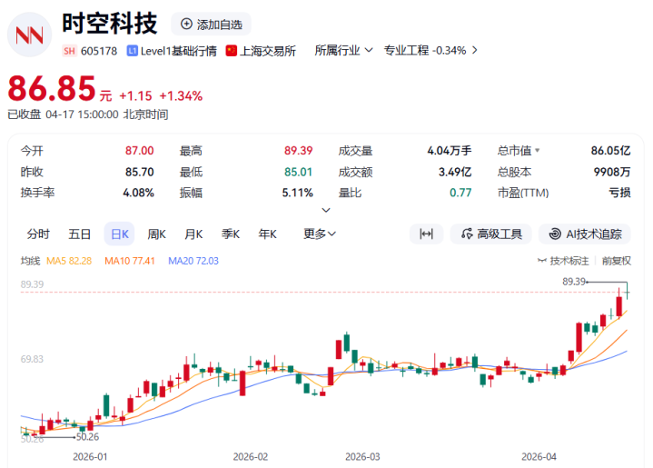 二级商场上,时空科技4月17日收报86.85元/股,总市值为86.05亿元。